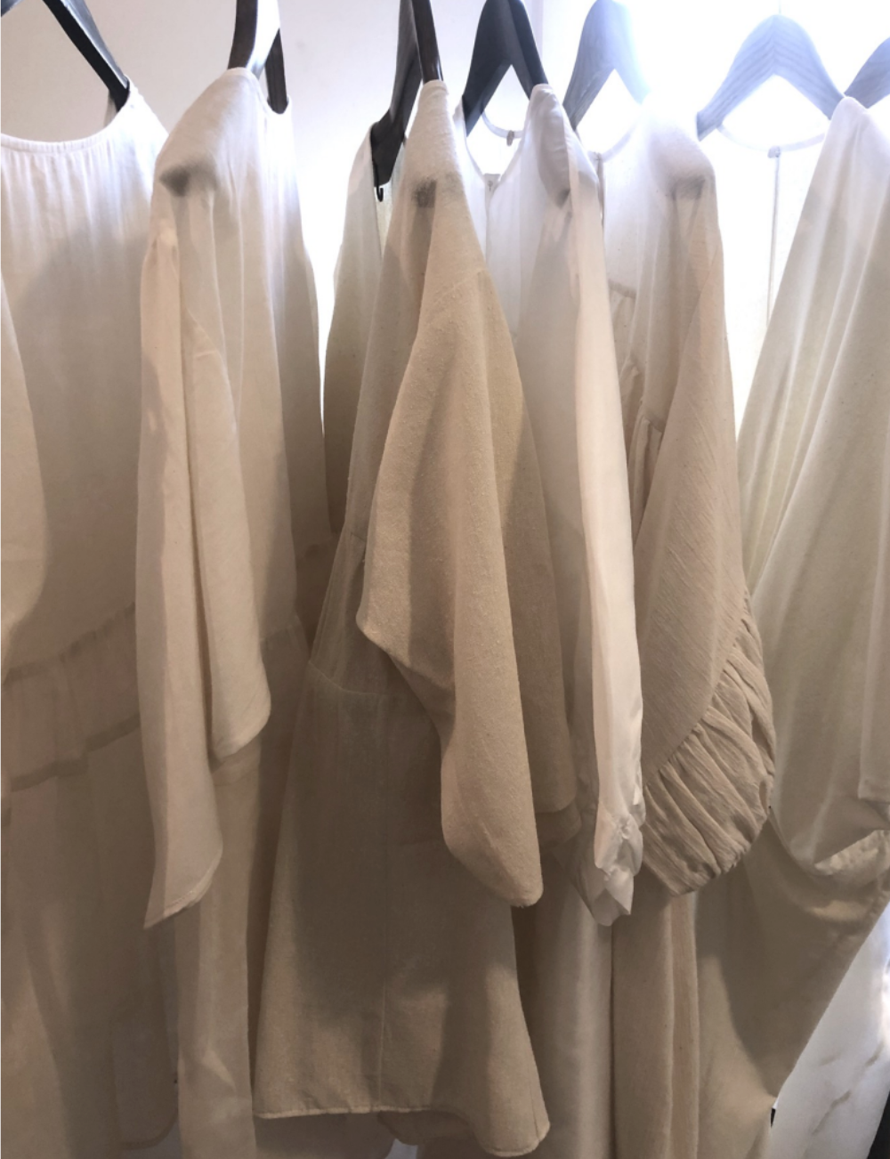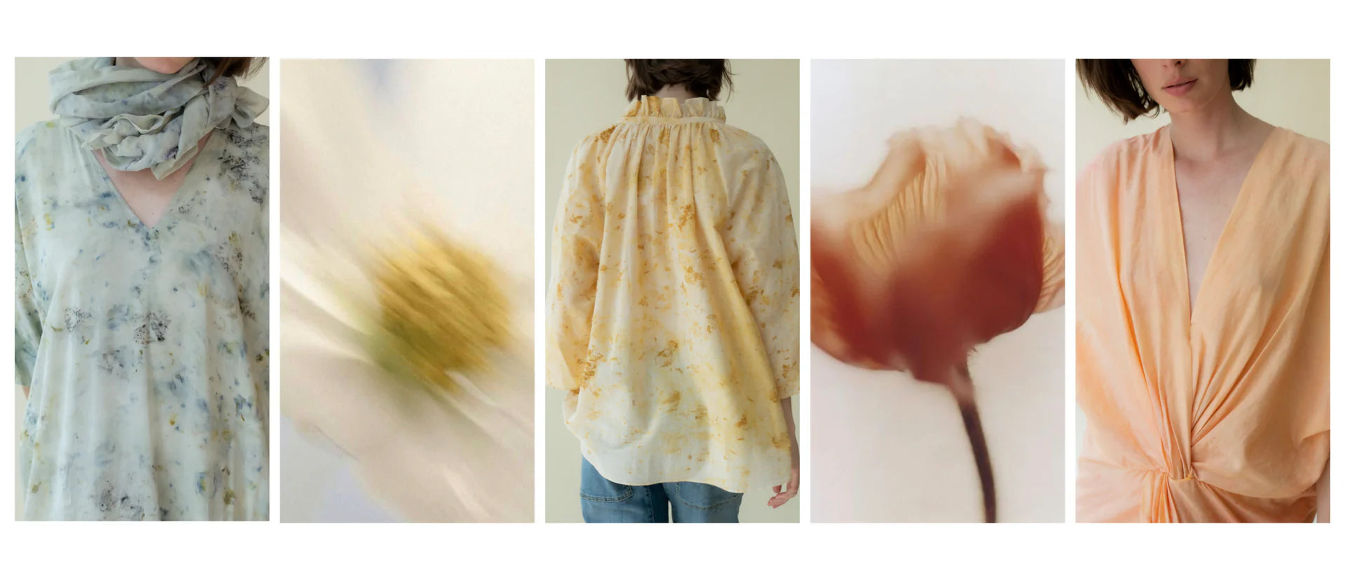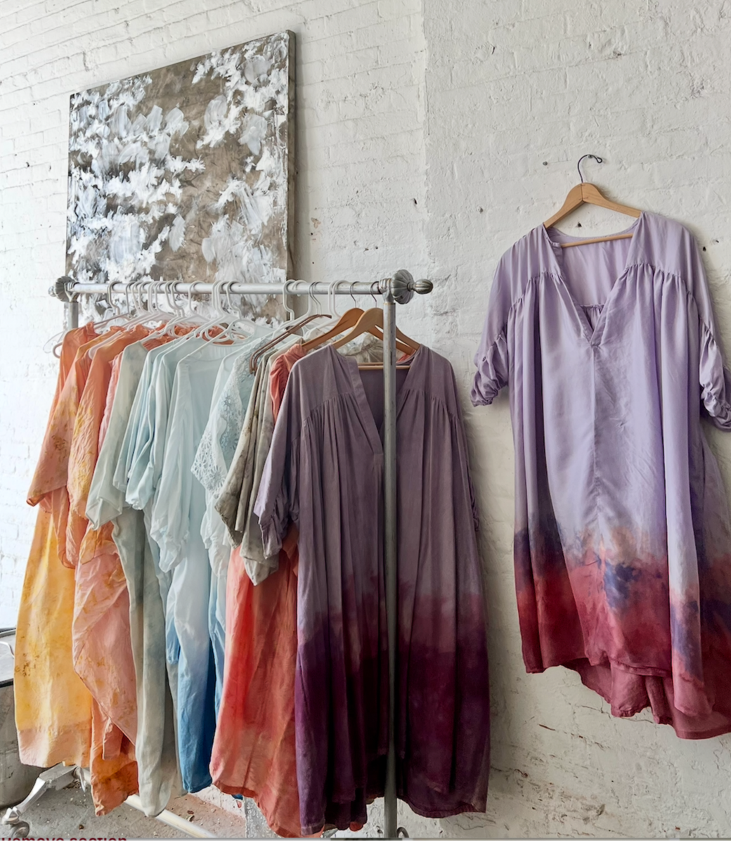 A finished garment, after final pressing. One of a kind, never to be duplicated. Botanical color depends on the time of year the colorants are harvested, the type of fabric, and the modifiers used. The process is slow and the result deeply personal. Each piece is labeled at the center back neck with a 14k gold-plated signet, stamped by hand. This philosophy is centered around a belief in the perfect beauty of nature and the joy found in personal expression.